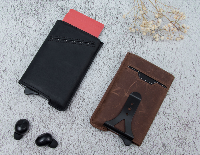 These multifunction wallet is made from quality cowhide leather and aluminum with RFID blocking technology to keep your cards and identity safe. Its light weight slim style makes it easy to fit in a pocket while the trigger pop-up card holder feature insures quick access to your cards and money.
